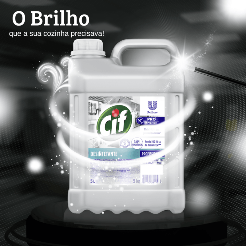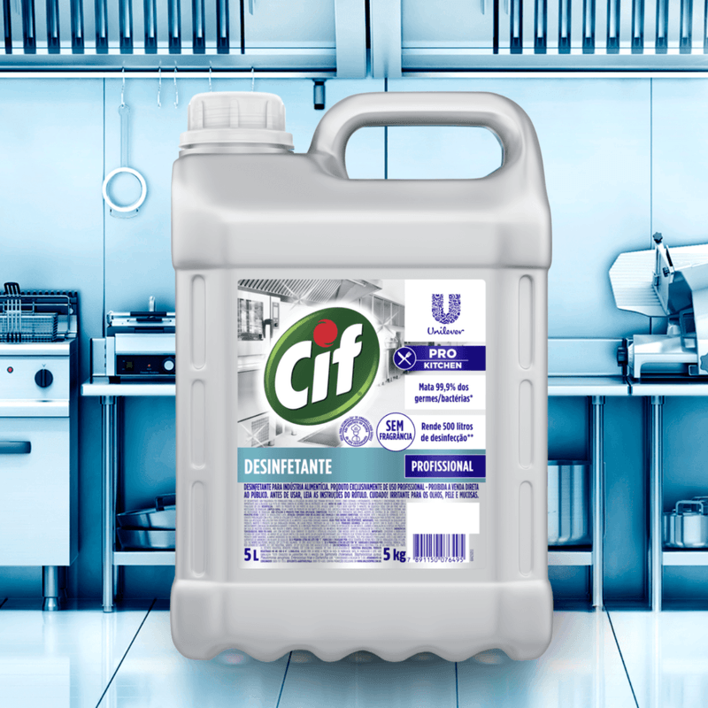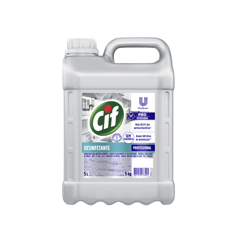 Cif Desinfetante 5L é um desinfetante concentrado sem perfume, indicado especialmente para áreas de manipulação de alimentos. O Desinfetante Cif possui fórmula multiuso que proporciona a limpeza das mais diversas superfícies, como mesas, balcões e pisos.