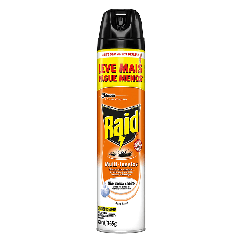 Raid multi-insetos spray tem uma fórmula elaborada especialmente para matar insetos voadores e rasteiros; não deixa cheiro e é eficaz em áreas internas e externas.