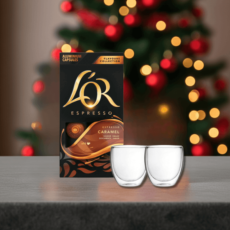 Kit Cápsula de Café Espresso Caramel Cx. 10un de 5,2g L'or + 02 Copos de Vidro Borossilicato 80ml Nobre