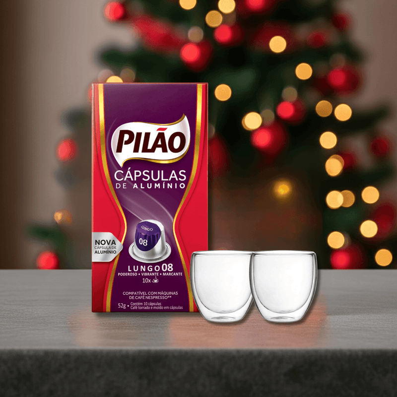 Kit Cápsula de Café Lungo 8 10x5,2g Pilão + 02 Copos de Vidro Borossilicato 80ml Nobre
