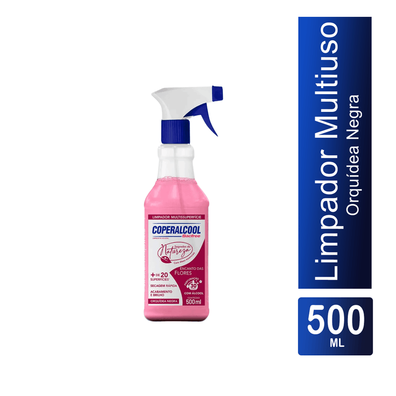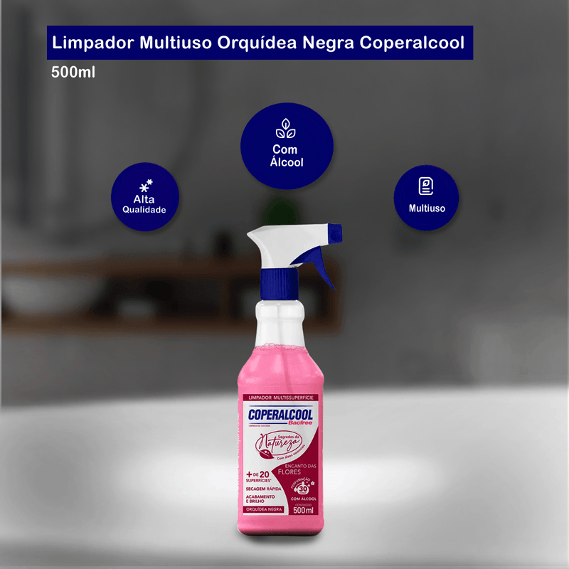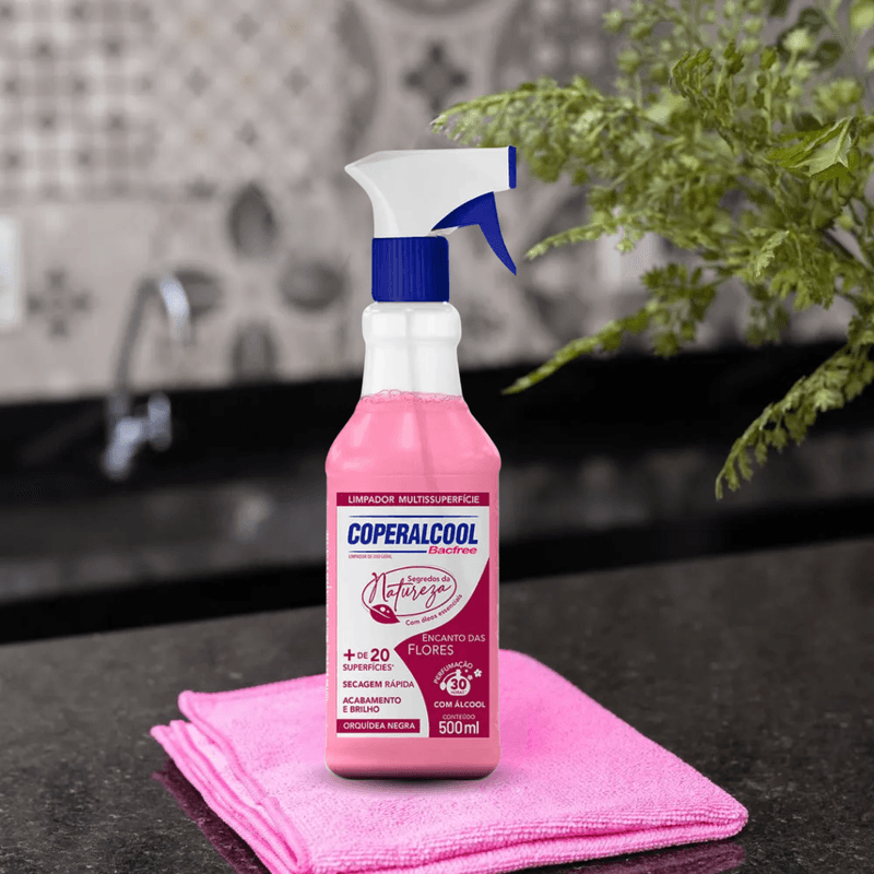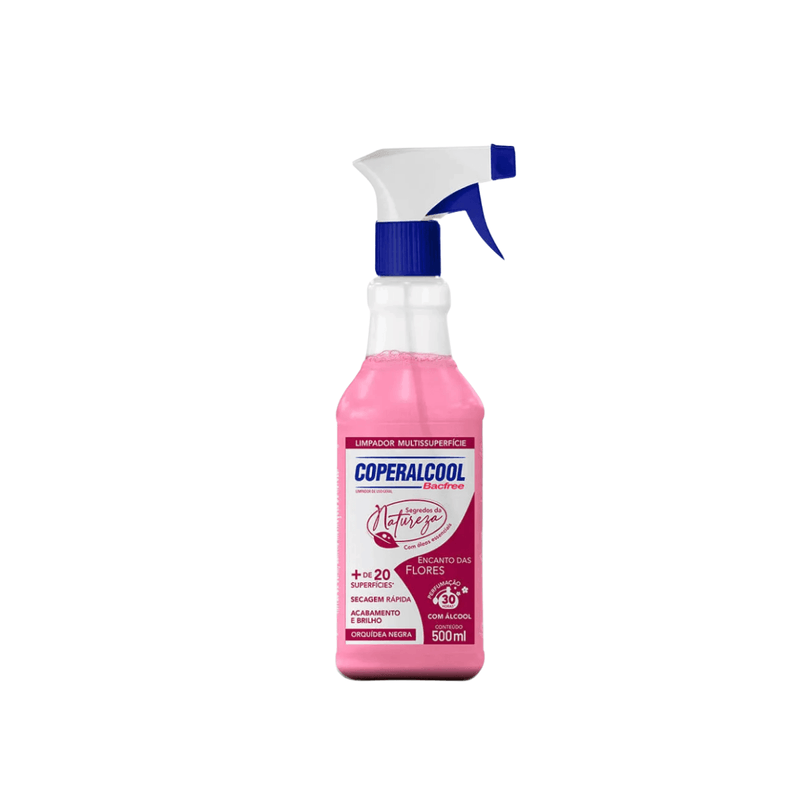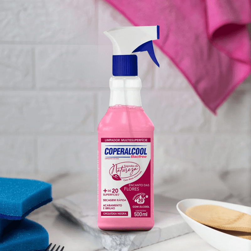 Primeiro produto Coperalcool Bacfree com sistema de gatilho anatômico, mais fácil de manusear e aplicar por ser um limpador multissuperfícies, se torna prático em sua aplicação.
