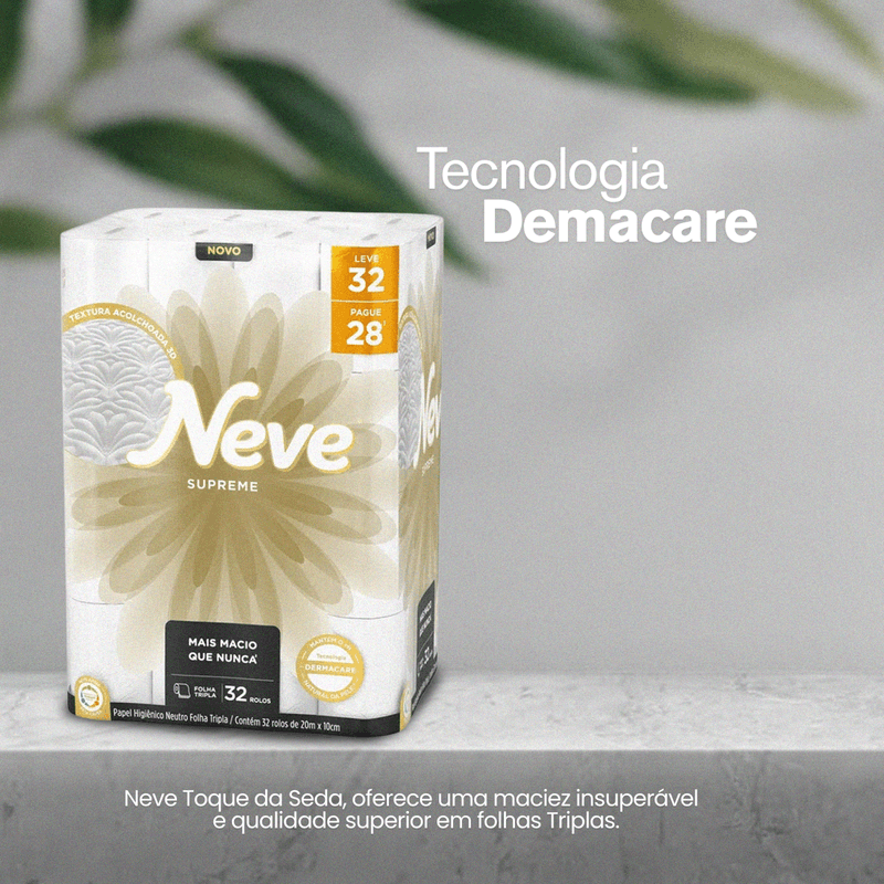 Papel higiênico neutro folha tripla de alta qualidade. Neve quer ajudar as pessoas a cuidarem de si, por isso desenvolveu um produto que proporciona maciez insuperável com mais absorção e resistência.