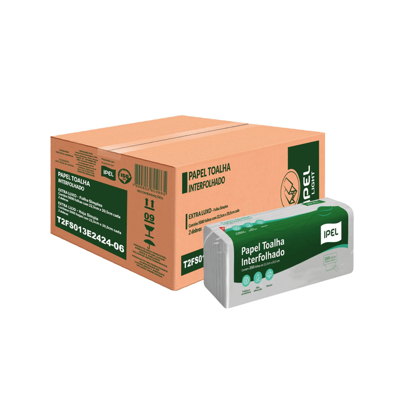 Papel Toalha Interfolha Ipel Light. Produzido com fibras celulósicas virgem. Tipo: Interfolha / 02 Dobras / Folha Simples Cor: Branco Dimensões: 22,5cm x 20,5cm Gramatura: 22 - 24g/m2 Embalagem: Contém 20 pacotes com 250 folhas cada