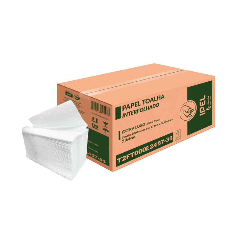 Papel Toalha Interfolha Laminado 2 Dobras Folha Tripla Fit Extra Luxo com 2.000 Folhas Ipel Tipo: Interfolha / 02 Dobras / Folha Tripla Cor: Branco Dimensões: 22,5cm x 20,5cm Gramatura: 38 - 40 g/m2 Embalagem: 01 caixa com 8 pacotes de 250 folhas cada