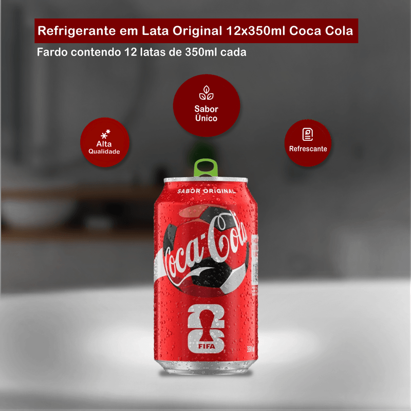 Refrigerante Lata 12x350ml Coca-Cola Refrigerante com sabor único e refrescante, vendido em mais de 200 países e considerado uma das maiores marcas do mundo. *No momento do envio a embalagem é sortida* Sabor: Original Embalagem: 01 fardo com 12 latas de 350ml