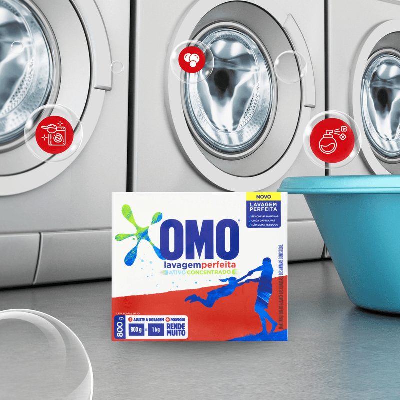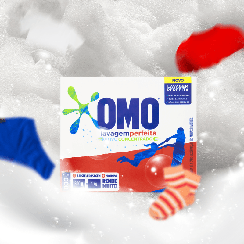O novo Omo foi totalmente reformulado e está mais poderoso possui fórmula que contém ingredientes biodegradáveis. Possui, ainda, pó ultrafino de rápida dissolução sendo menos poluição e CO2.
